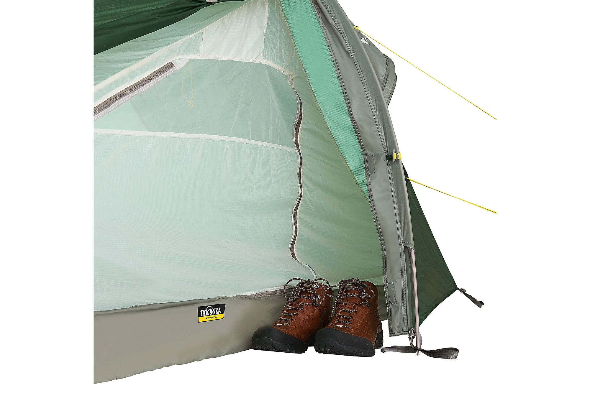 Das Tunnelzelt Kyrkja von Tatonka ist für eine Person ausgelegt. Die Apsis mit dem Seiteneingang bietet dabei genügend Platz für den Trekkingrucksack und sonstige Ausrüstung.